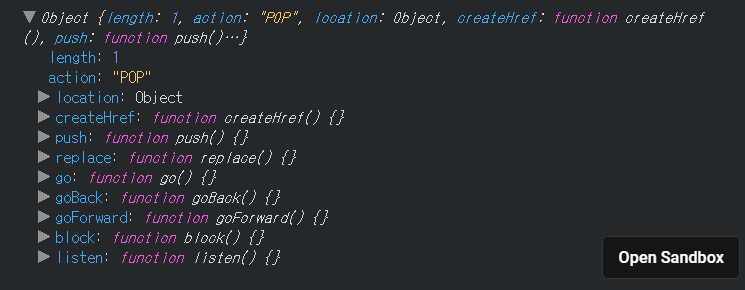보시면 history 객체는 location, createHref, push, replace, go, goBack, goForward, block, listen 라우터의 state를 가지고 있습니다.