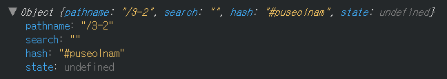 여기서 '3-2 프설남'가 URL이 되고 '/3-2#프설남'에서 '/3-2'는 pathname이라는 '#프설남'은 hash라는 라우터의 state 중 하나인 location 객체의 state에 해당한다고 이해하시면 될 것 같습니다.