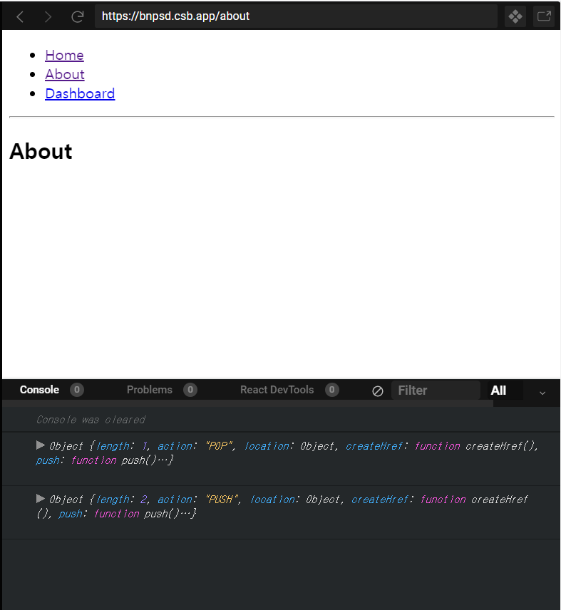 여기서 실험은 Home 화면을 초기화시킵니다. => About으로 갑니다 => Dashboard로 갑니다 =>