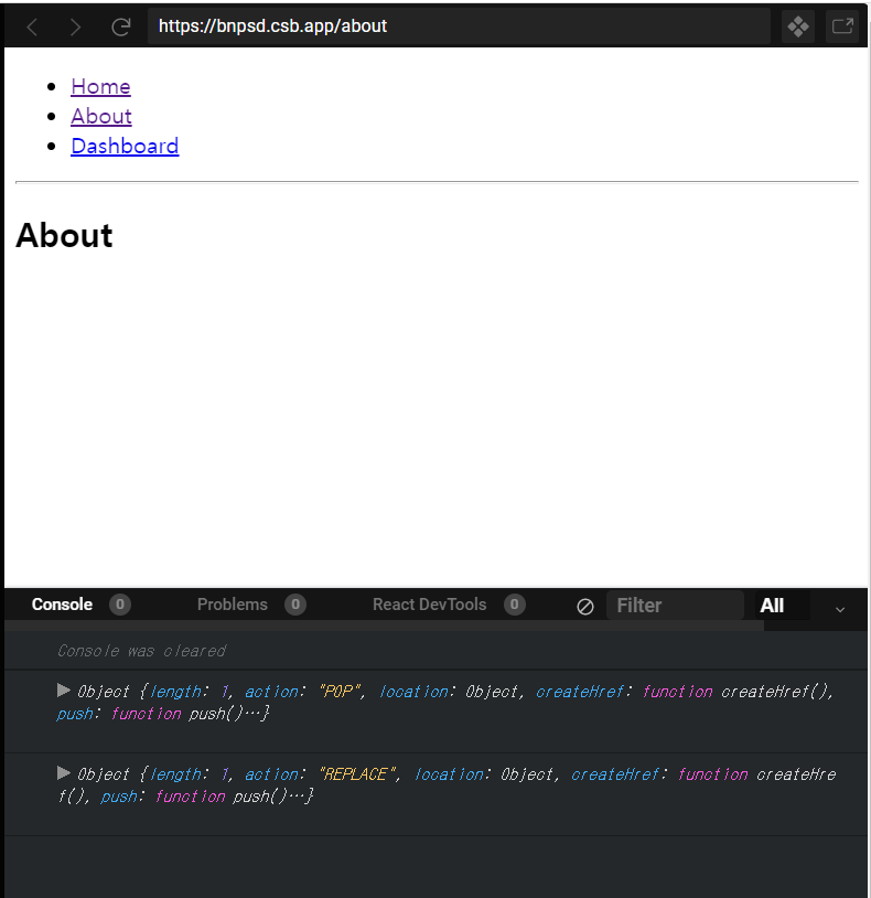 마찬가지로 실험 순서는 Home 화면을 초기화시킵니다. => About으로 갑니다. => Dashboard 로 갑니다. => Home으로 갑니다. => go(-2)버튼을 눌러 스택 2번째인 About 화면이 나타납니다 => 여기서 Dashboard로 가는replace버튼을 누릅니다. => 뒤로가기를 누릅니다.